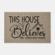 Die Eingangstür ist mit der Christlichen Verkündigung "Dieses Haus glaubt" auf einem bräunlichen Hintergrund, Details wie ein Hausdach und Christliches Kreuz mit Herzdetails. Fügen Sie Ihren Familiennamen oder benutzerdefinierten Text hinzu, um dieses Doormat einzigartig zu machen. Bestellen Sie noch heute selbst oder geben Sie als besonderes Geschenk.
