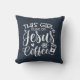 Dieses Mädchen läuft auf Jesus und das kaffee blaue Kissen in weißer dekorativer Schrift mit Kaffeetasse und Herzdetails.