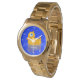 Meine niedliche gelbe Gummiente auf einer goldenen Armbanduhr mit einem hohen Bling-Faktor. Die blaue Hintergrundfarbe und der Text können nach Ihren Wünschen geändert werden.