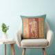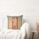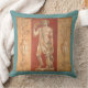 20" x 20" aquamarines Wurfkissen mit einem zerrissenen Bild des Dionysos, des Gottes der Weinherstellung und des rituellen Wahnsinns, auf Rot gestellt mit einer Schüssel Trauben zwischen zwei dekorativen Urnen auf Gold. Aquamariner Rücken. Sehen Sie sich die gesamte Toga Pillow Kollektion im DECOR an | Kissen Abschnitt.