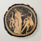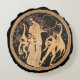 16" runder Kissen mit einem Bild auf beiden Seiten von Dionysus, griechischer Gott der Wein- und Weinherstellung und rituellen Wahnsinn, und die Satyrs auf Schwarz.In der griechischen Mythologie ist ein Satyr ein holzbewohnendes Wesen mit Kopf und Körper eines Menschen und den Ohren, Hörnern und Beinen einer Ziege. Die Satyrer waren als Lecherei und betrunkenes Merriment bekannt. Siehe passendes 20" x 20" Wurfkissen und 13" x 21" Lendenkissen.Die gesamte Toga-Pillow-Kollektion im DECOR| Kissen