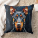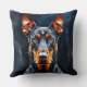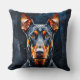 Stilisierte Darstellung eines Doberman-Hundes. Der Hund wird in einer frontalen Ansicht gezeigt, die seine auffälligen Merkmale hervorhebt, darunter große Ohren, die aufgehangen werden, und ein starkes, definiertes Maultier. Die Farbpalette ist mit tiefen Schwarzen und lebhaften Orangen gestaltet, was dem Hund ein kühnes und filigranes Aussehen verleiht. Der strukturierte Hintergrund kontrastiert mit den glatten, geometrischen Formen des Hundes und betont seine Form. Insgesamt gibt das Bild ein Gefühl von Stärke und Loyalität, das für die Doberman-Rasse charakteristisch ist.