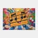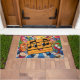 Ein Cartoon-Türmchen mit einem großen Lächeln und musikalischen Noten für die Augen tanzt mit Freude neben einer Gitarre, Schlagzeug und Trompete. Herzlich willkommen bei Ihren Lieben mit diesem - Erstaunliche farbenfrohe musikalische Noten Design für Ihre Füße vor der Türe.