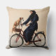 Konzept für die Vorderseite eines doppelseitigen Kissens: eine süße Szene einer Mutter, die mit ihrem Hund auf ihrem Fahrrad sitzt und mit einer Saite verbunden ist.