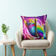 Dieses Design-Konzept zeigt eine Seite eines doppelseitigen Kissens und zeigt eine lebendige, farbenfrohe Katze mit leuchtendem Fell, das an einem Seil an einer hellen Neonkulisse im 5D-Stil hängt.