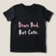 The image presents a minimalist yet impactful design with the phrase "Down Bad, But Cute" written in dripping, melting-style fonts. The text is set against a stark black background, creating a high-contrast, edgy aesthetic. The pink and white colors of the text add a touch of sweetness, balancing the rebellious tone.