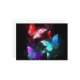 Drei helle, rote, lila, grüne, strukturierte Nachtschmetterlinge auf schwarz-leuchtendem Hintergrund.