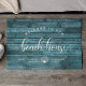 Moderne, schicke Pinselskripte, die in einem trendigen, typografisch gestalteten Design HERZLICH IN UNSEREM BEACH HOUSE lesen. Großzügige Dekoration des Strandhauses für Ihre Zuhause weg von der Zuhause. Unsere türkisfarbene, bedruckte Tor-matte aus Treibholz zeichnet sich durch ihre romantische und stilvolle Muschel aus.