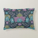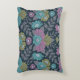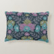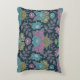 Dieses Kissen hat Blume in lila, blauen und olivgrünen Farbtönen, umgeben von lila Farnfronten und Blätter auf dunkelblauem Hintergrund.