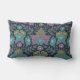Dieses rechteckige Kissen hat Blume in lila, blauen und olivgrün, umgeben von lila Farnfronten und Blätter auf dunkelblauem Hintergrund.