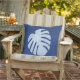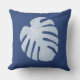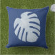 Tropisches Blattkissen in dunkelblauem. Front hat ein großes Blatt, mit gemustertem Blätter auf der Rückseite. Das Blätter ist auf einem dunkelblauen Hintergrund hellblau, aber Sie können den Hintergrund zu jeder möglicher Farbe ändern, die Sie mögen.