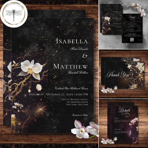 Entdecken Sie die mystische Geschichte Ihrer Liebe mit unserer zauberhaften gotischen Hochzeitskarte. Dieses dunkel bezaubernde Design zeichnet sich durch ein Schwarz-Weiß-Design aus, das die Essenz zeitloser Romantik hervorruft. Die zarten Orchideen aus Weiß und Gold nehmen die Bühne in den Mittelpunkt eines geheimnisvollen Sternenhimmels. Die dunkle Eleganz wird durch den weißen Text noch verstärkt. Dieses Design ist eine kunstvolle Verschmelzung von Schönheit und Drama, die verspricht, einen bezaubernden Ton für Ihren besonderen Tag Set. Wählen Sie dieses Design, um eine Hochzeit zu schaffen, die so einzigartig und unvergesslich ist wie Ihre Liebe. Es wurde von Simply Farmhouse Press erschaffen und ist Teil der Hochzeitssuite der dunkelgotischen Zauber Black & White Orchid.