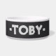 dunkelgraue Haustierschüssel für Ihren Schoßhund oder die Nahrung oder das Wasser der Katze.  Dieses Beispiel hat Toby, der auf es geschrieben wird, aber es kann zum Namen Ihrer Präferenz geändert werden.  Andere Farben sind im Speicher verfügbar.