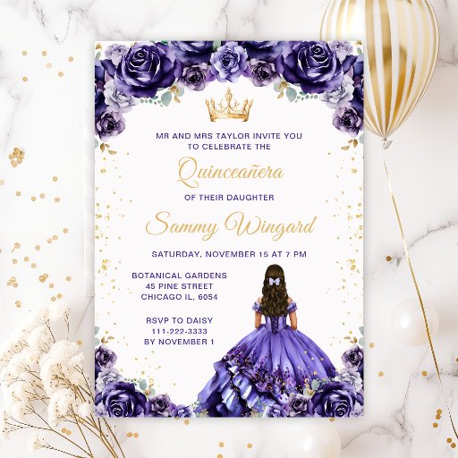 Dieser elegante und glamouröse Quinceañera Geburtstags-Untersetzer besticht durch eine wunderschöne Prinzessin mit dunklem Haar in einem lila, dunklen Ball. Der Text kombiniert handgeschriebene Skripte mit modernen serifenlosen Schriftart für ein elegantes und raffiniertes Aussehen. Die Blumenarrangements und die Goldkonfetti bilden die perfekte Mischung aus rustikal und schick. Grafiken von www.etsy.com/uk/shop/SunflowerDayLove