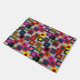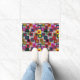 Diese Türmatte hat ein geometrisches Design von Quadraten in braun, schwarz, ziegelrot, gelb, aquamarin, grün, lila, gold, rosa, rot, grau auf einem Feld von leichter grau.
