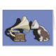 Ein Hund mit einem Kratzerkegel heulend an einem antiken Schallplattenspieler mit einem Messingtrichterhorn. Farbe, Schatten für nettes, 3 d-Effekt, auf T - Shirts, Plakate, Karten, Geschenke.