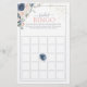 Modernes, elegantes Brautparty-Spiel "Bridal Bingo" mit trendig staubblauen und rot-rosa Blüten, Aquarellfloralen, handgeschriebenen Schriftzeichen und Imitaten Goldstaub, drucken oder personalisieren Sie Ihre Spielfragen. Teil einer Sammlung Suite. Suite hier: https://www.zazzle.com/collections/light_dusty_blue_blush_pink_gold_wedding_suite-119156539216388938 Copyright Anaastasi Surridge for Elegant Invites, alle Rechte vorbehalten.