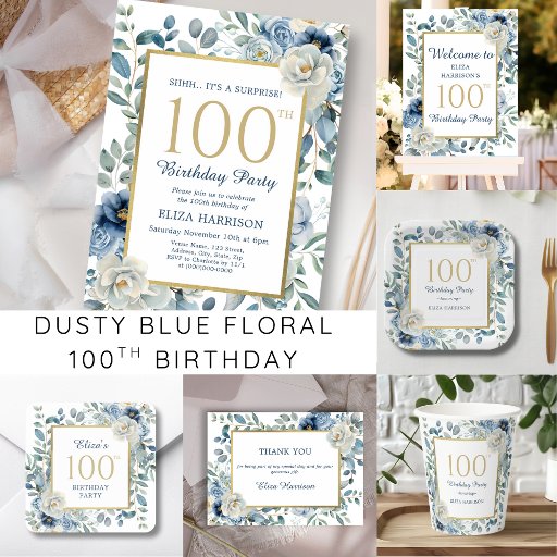 Dusty Blue Floral 100th BirthdayDesignt von Natalie