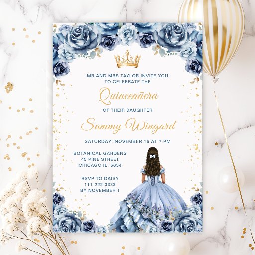 Diese elegante und glamouröse Quinceañera Geburtstagseinladung besticht durch eine schöne Prinzessin mit dunklem Haar in einem staubigen blauen Ball-Gown. Der Text kombiniert handgeschriebene Skripte mit modernen serifenlosen Schriftart für ein elegantes und raffiniertes Aussehen. Die Blumenarrangements und die Goldkonfetti bilden die perfekte Mischung aus rustikal und schick. Grafiken von www.etsy.com/uk/shop/SunflowerDayLove
