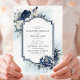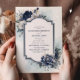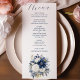 Dusty Blue und Navy Floral Elegante Hochzeit MenükarteDusty Blue und Navy Floral Elegante Hochzeit Menükarte (Vorderseite)Dusty Blue und Navy Floral Elegante Hochzeit Menükarte (Rückseite)
