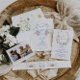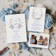 Ein raffiniertes und romantisches Hochzeitsdesign mit einem staubblauen Monogramm-Wappen, gerahmt von Aquarellfloralen in Pastelllavender, Rose und Pfirsichfarben. Das Layout umfasst weiche Vegetation, elegante Serif- und Schriftzeichen sowie ein zeitloses Format, das perfekt für formelle Hochzeiten geeignet ist. Ideal für Frühlings- oder Sommerzeremonien mit Garten, Herrenhaus oder Kapelle. Vollständig anpassbar mit den Initialen, Namen, Datum, Veranstaltungsort und optionalen Empfang-Details. Modernes Erbaustil mit klassischer Grazie.