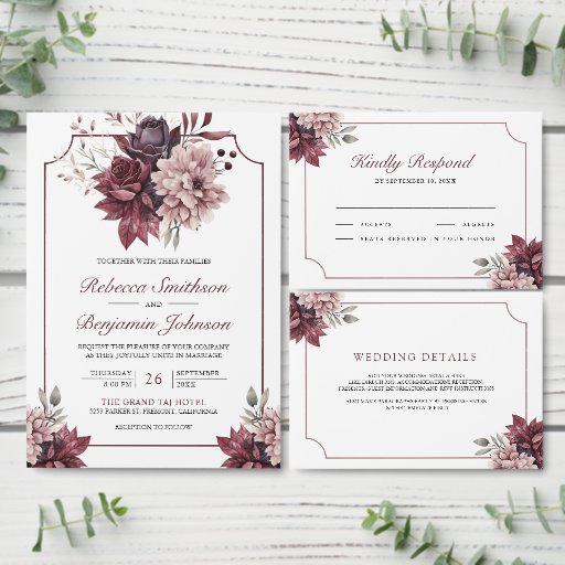 Dusty Pink Burgundy Floral Frame QR Code Wedding Einladung