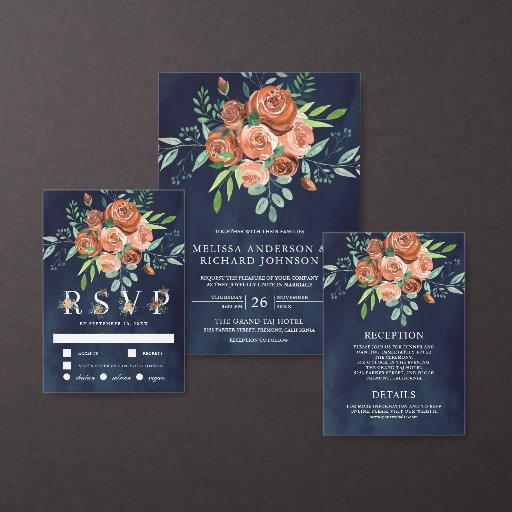 Earthy Burnt Orange Rose Floral Navy Blue Wedding Einladung (Personalisiere diese Kollektion eines unabhängigen Creators.)Earthy Burnt Orange Rose Floral Navy Blue Wedding Einladung (Vorderseite)Earthy Burnt Orange Rose Floral Navy Blue Wedding Einladung (Rückseite)