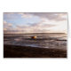 Ein Spätsommersonnenuntergang verlässt bei Ebbe einen alleinen Rowboat angeschwemmt auf dem Sand, während die Verblassenstrahlen der Sonne alles golden drehen.