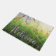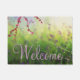 Ein silbernes Spinnennetz, das mit glitzerndem Tau bedeckt ist, lässt die Glitzer in der warmen Sonne eines frisch grünen Frühlingsmorgens fallen. Die winzigen rosa Blüten eines Baumes hängen hinter dem Netz, was sich in den Tröpfchen widerspiegelt.