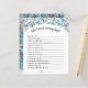 Ein Blatt Papier mit dem Spiel "Wer kennt die Mami am besten?" für eine Babydusche, dekoriert mit bezaubernden Aquarellen von Pflanze mit weichen pastellfarbenen smaragdgrünen und blauen Blätter, Ästen und weichen rosa Blume.