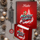 Ein fröhlicher Cartoon mit grüner Kleidung und spitzen Ohren Wellen aus einer schneebedeckten Landschaft. Die Wörter "Weihnachten" sind in großen, farbigen, graffiti-artigen Schriften mit einem rosa und blauen Farbschema geschrieben. Der Hintergrund ist hell rot, was auf eine festliche Urlaubsatmosphäre hindeutet. Schneeflocken fallen sanft ab, was das winterliche Gefühl noch verstärkt.