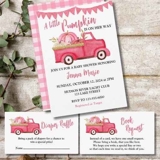 Feiern Sie die bevorstehende Ankunft Ihres Kleinen mit diesem charmanten Babyduschaufkleber "A Little Pumpkin is On Your Way"! Dieses reizvolle Design besticht durch einen Vintagen rosafarbenen LKW, der mit kräftigen Kürbissen beladen ist und das Wesen des Herbstes und die Freude, ein kleines Mädchen willkommen zu heißen, perfekt einfängt. Der rustikale Charme und die skurrile Abbildung machen diesen Aufkleber ideal für eine gemütliche Herbst-Babydusche.