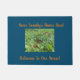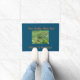 Eine 18"x24" dunkle Aquamarine, farbige Türmatte, mit einem Bild, eines wunderschönen Monarchen-Schmetterlings, auf dem Gras, mit einem mittelorangen Farbton. Text, der Ihnen lasse, es mit "Ihr Familienname hier!", (oben), zu personalisieren und auch "Herzlich Willkommen in unserem Haus!" (unten), davon zu hören.