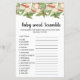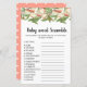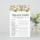 ein Motiv mit süßem Pfirsichbein, niedliche Pfirsichpfeile, eine Wortkarte für Babydusche. Die Wörter auf dieser Karte sind alle mit Babys verwandt und wurden verdreht. Die Gäste werden sich darum bemühen, zu sehen, wer sie alle zuerst entwirren kann! ANTWORTSCHLÜSSEL: 1. Kindersitz; 2. Milch 3. Laufstall 4. Schnuller Das fünfte Element ist ein Windelrocksessel. 7. Kinderzimmer 8. Babymonitor; 9. Schluckauf 10. Formel. 11. Gummiklemme 12. Rolle. 13. Überwachung. 14. Verbindung 15. Thermometer.