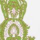 Dieses Design zeigt ein kompliziertes und verziertes Blumenmuster. Das Design zeichnet sich durch symmetrische Arrangements von rebenartigen Elementen mit zarten Blätter und Blume aus. Die vorherrschenden Farbtöne sind grün, mit rosa-weißen Farbtupfern, die eine harmonische und elegante Komposition schaffen. Das Muster ist sehr detailliert, mit aufwändigen Linien und dekorativen Schnörkeln durchgängig. Es scheint ein klassisches und traditionelles Design zu sein, das an Vintage Tapeten- oder Textilmuster erinnert.