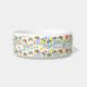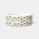Eine Keramikschale, verziert mit einem farbenfrohen Muster aus Regenbögen, Federn und Punkten auf weißem Hintergrund. Das Design wirkt fröhlich und verspielt.