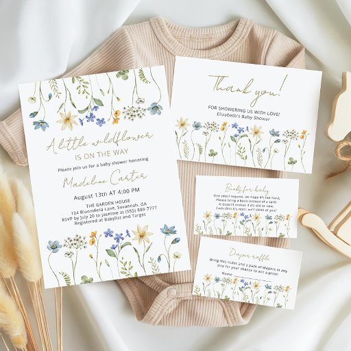 Feiern Sie die Ankunft einer kleinen Wildblume mit dieser charmanten Baby-Dusche Einladung. Mit handbemalten Aquarellfarben in sanften Grün-, Gelb- und Blautönen strahlt dieses Design eine frische und natürliche Eleganz aus. Die zarte Blumengestelle bildet einen Rahmen für eine stilvolle Schriftzeichen-Typografie, die sich perfekt für eine Frühjahr- oder Sommerdusche eignet. Personalisieren Sie mit Veranstaltungsdetails und passendem Büromaterial für einen koordinierten Look!