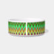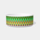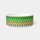 Eine runde Schüssel mit einem farbenfrohen Zickzackmuster mit lebendigen Grün-, Blau-, Gelb- und Rottönen an der Seite. Der Innenraum ist schlicht weiß.