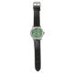 Eine stilvolle Armbanduhr mit rundem Gesicht mit einem lebendigen grünen und gelben tropischen Blattdesign. Sie hat ein silbernes Gehäuse und ein schwarzes Lederarmband.