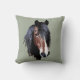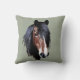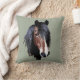 Ein Kissen oder ein Kissen mit einem hübschen Kopf des Pferds auf einer kundengerechten Hintergrundfarbe eines blassen weisen Grüns. Das Pferd hat eine starke schwarze Mähne und eine weiße Flamme.