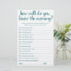 "Wie gut kennst du Mami?" Wer kennt die zukünftige Mutter am besten? Einfache Babydusche oder Gender zeigen das Party mit einem lässigen, handgeschriebenen Drehbuch. Das klassische Design beinhaltet ein modernes, handhabbares Offerttipografie-Overlay. Für andere Farben oder passende Produkte, besuchen Sie bitte den JustFharryn Zazzle Store, oder kontaktieren Sie den Designer, c/o Fharryn@yahoo.com Alle Rechte vorbehalten. #bohochic #zazzlemade"