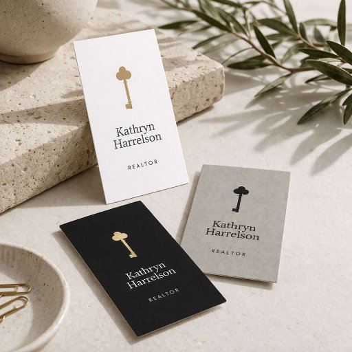 Koordiniert bis 12.01 Uhr die Vorlage der Small Imitats Gold Key Realtor Logo Business Card. Auf dieser personalisierten Notizkarte ist ein Vintager Skelettschlüssel in Imitat gold elegant mit Ihrem Namen oder Firmennamen gestylt. © 1201AM CREATIVE