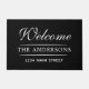 Modernes und elegantes Haus. Dieses Design enthält den weißen Text "Welcome" in der Kalligraphie-Schrift mit Nachname , der Zuhause-Straßenadresse und den einfachen horizontalen Trennlinien-Akzenten.