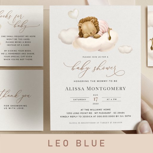 Ein kleiner Löwe schläft auf einer Wolke. Whimsikale, handbemalte Wasserfarben und moderne Typografie ergänzen mein Design. Personalisieren Sie dieses niedliche Bear Baby Shower Set mit Ihren Babyduschdetails einfach und schnell, drücken Sie den Knopf Anpassen, um es weiter zu arrangieren, und formatieren Sie den Stil und die Platzierung des Textes.