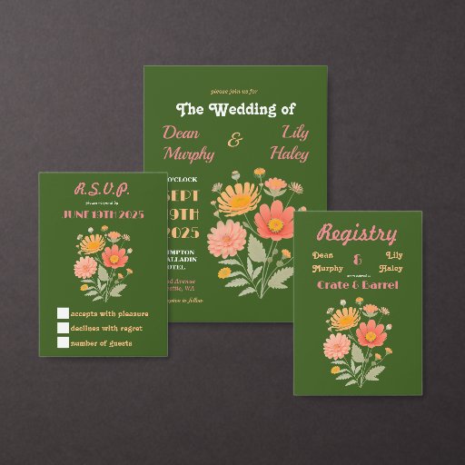 Diese mutige und auffällige Hochzeitseinladung wurde mit Retro-Ästhetik geschaffen. Es zeichnet sich durch einen farbenfrohen Bruch und eine spielerische Typografie aus, die sofort Aufmerksamkeit erregt. Vintag inspirierte Blumenelemente verleihen dem Gesamtbild ein Gefühl von Wärme und Eleganz und machen es zu einer idealen Wahl für Paare, die den nostalgischen Charme der Vergangenheit schätzen.