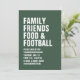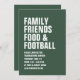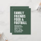 Mit fett weißer Typografie ist diese Jägergrün-Erntedank-Dinner-Einladung leicht anpassbar und Set für ein lustiges und lässiges Truthahnfest. Der Text lautet "Familienfreunde Essen & Fußball", aber er kann geändert werden, um zu lesen, was Sie wollen und die Farbe ist auch anpassbar! Günstig für Friendsgiving auch! Finden Sie passende Erntedank-Accessoires in der Kollektion Lea Delaveris Design Bold Modern Erntedank.