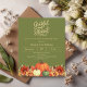 Ein moosgrüner Hintergrund. Die Einrichtung ist mit Kürbissen und orangen und gelben Blumen geschmückt. Personalisieren Sie die Party-Details und fügen Sie sie hinzu. Text-Skript: Dankbar und gesegnet. 1 Blatt = 1 Einladung mit Druckkante bis Kante.