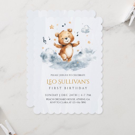Feiern Sie Ihren großen Meilenstein mit dieser traumhaften bärenbezogenen Einladung zum ersten Geburtstag! Mit einem fröhlichen Teddybär in Aquarellfarbe, der auf flauschigen Wolken tanzt, umgeben von musikalischen Noten und goldenen Stars, ist dieses Design perfekt für ein gemütliches, skurriles Party. Die weiche Pastellpalette und die handbemalten Kunstwerke machen es zu einem idealen Ort für einen besonderen Tag für einen kleinen Jungen. Mit den intuitiven Editing-Tools von Zazzle können Sie diese reizvolle Einladung ganz einfach mit Ihren Party-Details personalisieren. Auf hochwertigen Pkw gedruckt, ist es ein charmanter Weg, Liebende zum ersten Geburtstag Ihres Kindes einzuladen. Es stehen koordinierende Elemente zur Verfügung, die zu Ihrem Thema passen. Planen Sie Ihr Party in wenigen Minuten!