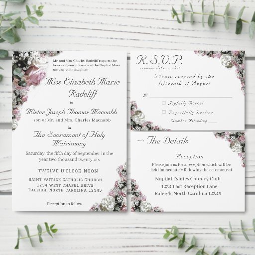 Elegantes Design zeichnet sich durch das wunderschöne und realistische Bild kaskadierender Blume aus, darunter rosa Rosen und weiße Hydrangea als Rahmen zu oben links und unteren rechten Ecken. Nach dem klassischen Format für eine katholische Hochzeit wird Text in einem eleganten silberfarbenen Schriftart angezeigt. Reverse zeigt das Bild eines silberfarbenen Kreuzes mit verbundenen Hochzeitsringen. Auf beiden Seiten des Kreuzes werden die Initialen von Braut und Bräutigam angezeigt. Ihr anpassbarer Text wird oben in einem eleganten Nuptial Schriftart angezeigt. Konzipiert, um sich mit der "Pink & White Floral Katholic Wedding Suite" abzustimmen.