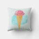 Ein gelbes Kissen mit einer köstlichen Ice-Creme-Illustration, mit einer Kugel aus rosa Erdbeereis, das von einem Waffelkegel gehalten wird. Set auf einem Aqua Blue Aqua Aquarell Farbe Spritzer / Pinselstrich.